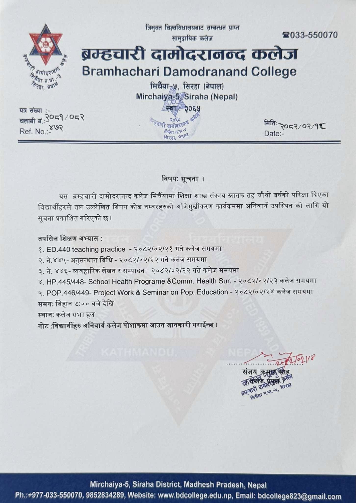 Bramhachari Damodranand CollegeMirchaiya-5, Siraha (Nepal)NOTICEDate: 2082/02/18 B.S. This is to notify all the students of the Faculty of Education, 4th Year, that the following subject codes have been approved for practical and seminar participation. Students are required to be present mandatorily as per the schedule mentioned below: Subjects and Dates: ED. 440 – Teaching Practice:…